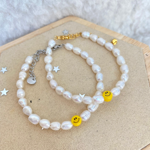 Dit armbandje heeft mooie zoetwaterparels en een gele smiley. Qua matchende sieraden staan er ook zoetwaterparel kettingen online.