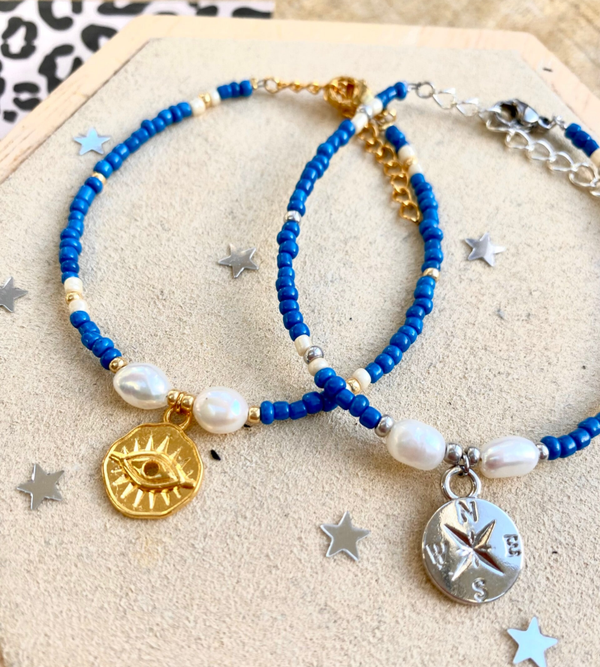 ✩ Handgemaakt armbandje met kobaltblauwe 2mm kralen, parel details en een zilver kompasbedeltje