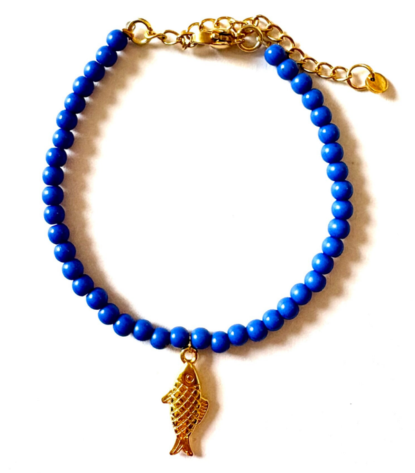 De Lua Gold armband heeft een frisse energie. De blauwe kralen zorgen voor een frisse uitstraling, terwijl de gouden visbedel een speels detail toevoegt. Het is een armband die subtiel oogt, maar toch karakter geeft aan je dagelijkse stijl.