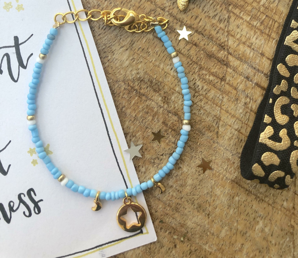 Als jij van blauw houdt is dit het perfect armbandje voor jou! Deze leuke kleur maakt jou armparty een stuk vrolijker! Het armbandje heeft gouden details tussendoor en er zit een open sterretje en twee mini maantjes aan.