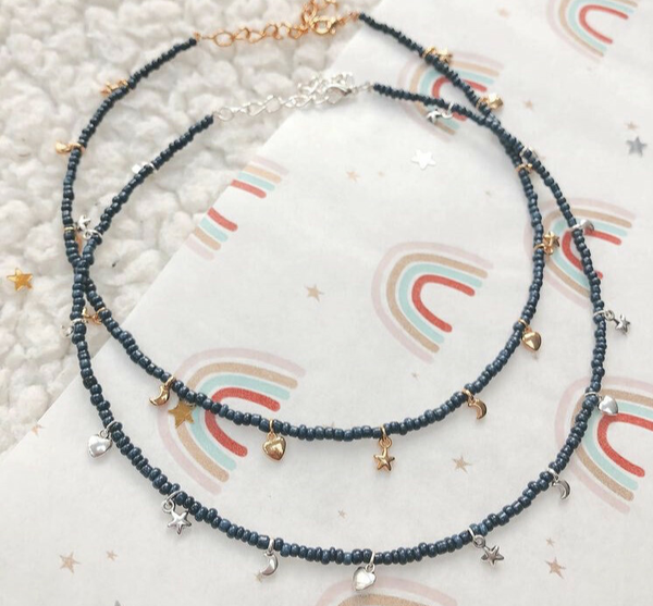 Dit super mooie donkerblauwe kettinkje heeft kleine schattige mini bedeltjes! Het kettinkje valt als een choker! Deze is super leuk om te combineren met onze lange minimalistische kettinkjes