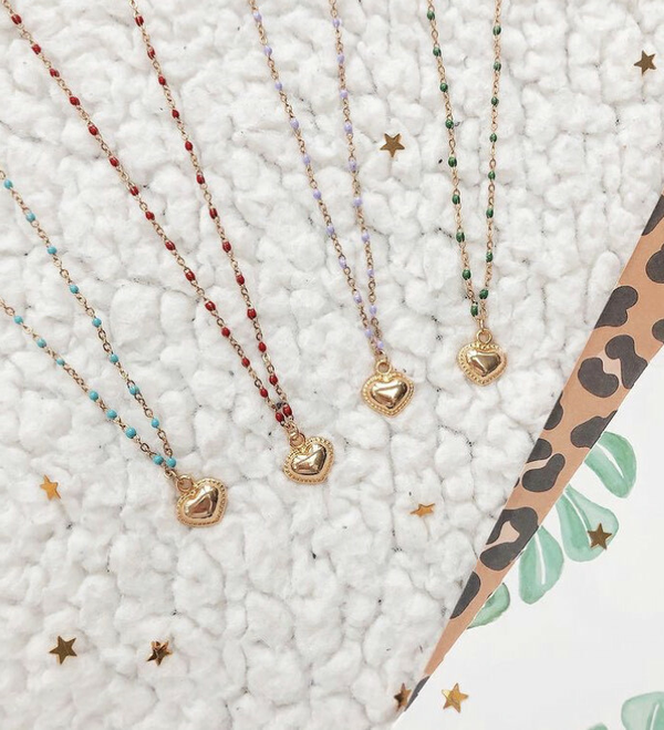 Dit mooie kettinkje heeft gekleurde dots en een hartjes bedeltje. Het kettinkje is super makkelijk om te combineren maar ook los is hij super leuk! Hij is in verschillende kleuren verkrijgbaar.