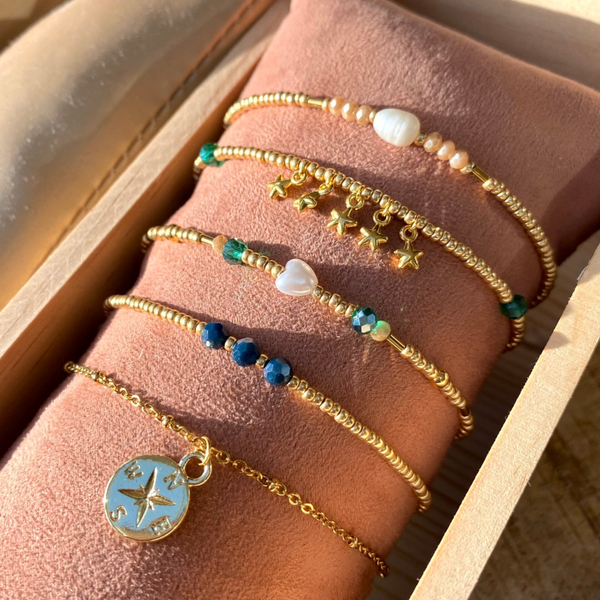 Hoe schattig is dit gouden armbandje met shiny beige steentjes en een zoetwaterparel?! Super leuk om te combineren met andere minimalistische armbandjes.
